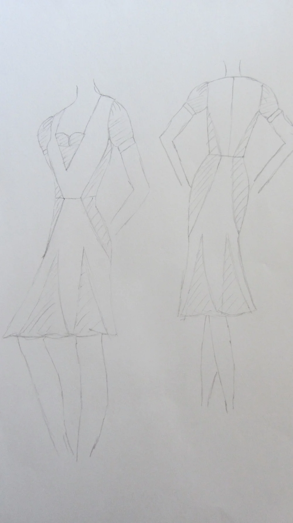 I love the silhouette and the flow of the skirt. The bustier detail is wonderful and I'm intrigued by the sleeves. The contrasting patterns on the panels and their sharp lines are what really makes it for me. Given that I only have six weeks in the class, that the idea is to have a completed dress by the end of it and the fact that I have never drafted a pattern in my life I realise that this would be beyond my capabilities. I have simplified it quite a bit while keeping some of the details. I haven't yet shared this with my teacher so some of what you will see may change. Please also forgive my sketching - drawing is not one of my talents!