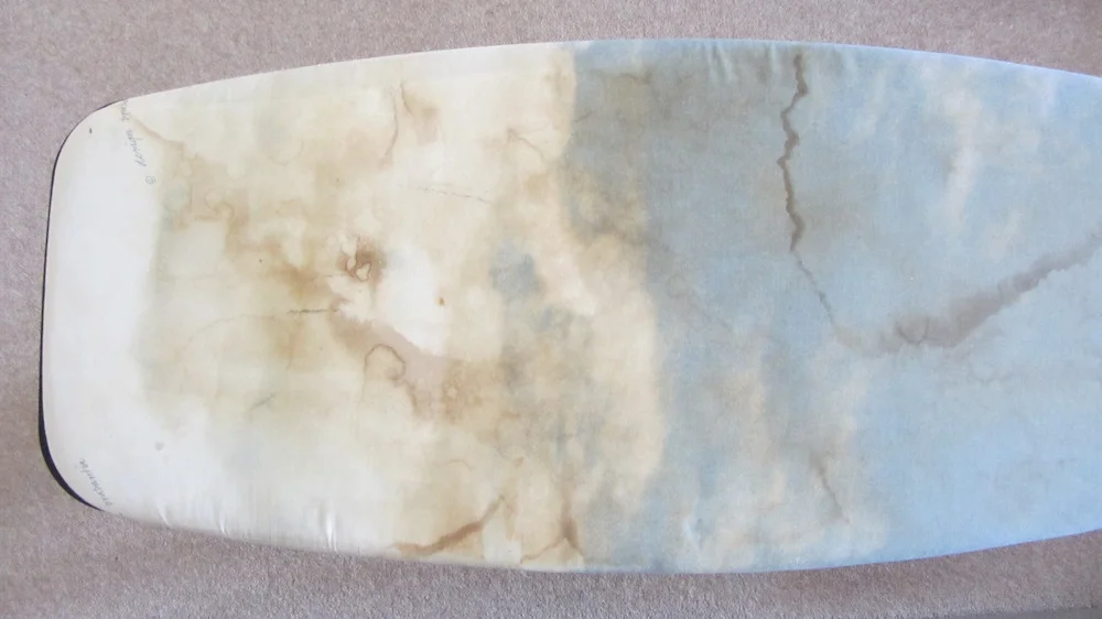 Our ironing board is HUGE and was in desperate need of a makeover. You can see the discolouration below which had seeped through to the polyurethane pad. I suspect this caused the discolouring as moisture can't escape through a non-natural fibre. I also had a feeling that one of the layers below the cover had split, or melted, and I was right, there was a rather large hole in the foam layer where it had tried to fuse itself to the metal frame.