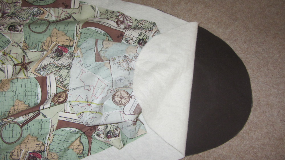 Create your bias tape, if making your own. Open the tape and pin one edge to the raw edge of your sandwiched cover. Begin at the end where your elastic/string pulls tight. Machine sew all the way round.