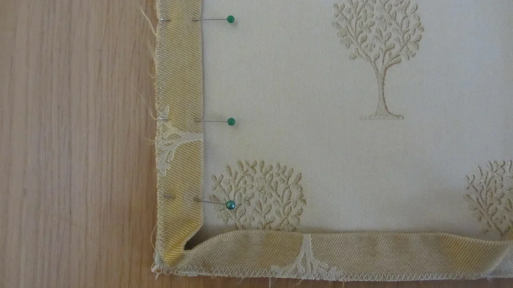 Add your piping or trim to the right side of the front cover. Do this by starting somewhere inconspicuous enough to hide the join. I would suggest at the centre of the bottom seam. Pin the raw edges together but leave a tail of a few centimetres. When you reach the corner, turn the piping/trim into a tight corner and pin in place. Continue all the way around.