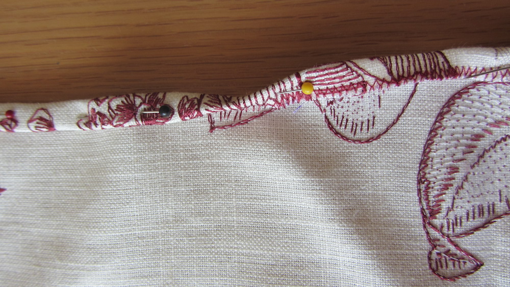 Take your back pieces. Turn under the overlapping seam by 1cm and then another 1cm. Stitch in place.
