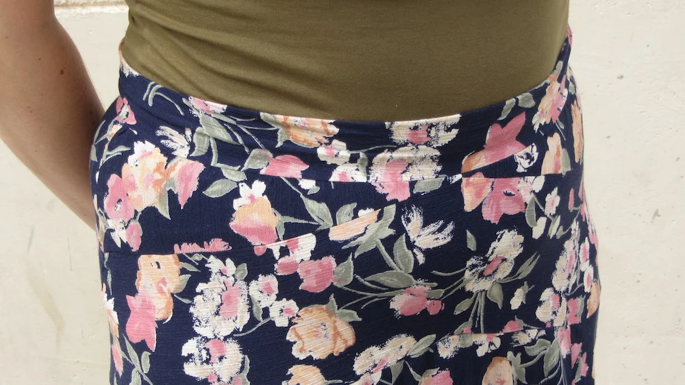 Sadly Sunni was out of fabric. Unsurprisingly it was very popular and sold quickly. The skirt remained in the corner until a possible solution hit me on my walk home from work quite a few weeks later. "What if I divide up the panel into several pieces and stitch them together? The print is quite busy - I might just get away with it. I have nothing to lose - I can't wear the skirt as it is and I can't create another item from it. And the fabric is too pretty to gather dust in the corner." Turns out I didn't have enough for two side panels but I could get two more back panels created from three pieces each. Suddenly I had a full skirt! As I hoped, the print covers it pretty well and if I look down the panel I have trouble finding the seam lines although it is pretty obvious when your pressing the skirt!