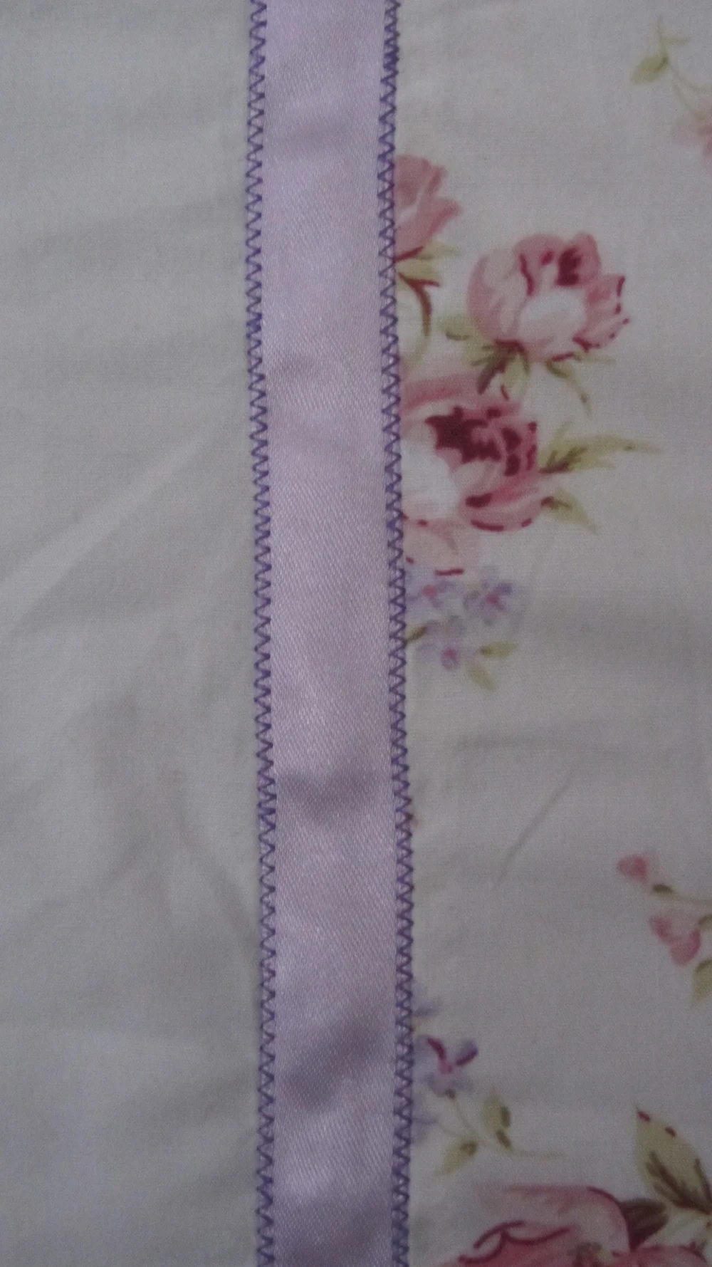 To create the panels, I cut the newly green fabric in half and keep the floral as it came. Unfortunately the green shrank by a couple of centimetres meaning I needed to make full use of the selvages and reduce the seam allowances to 5mm. All the seams are overlocked for a nice finish. A pale purple ribbon, attached with a narrow zig zag stitch, finishes the cover nicely as well as hiding the seam lines.