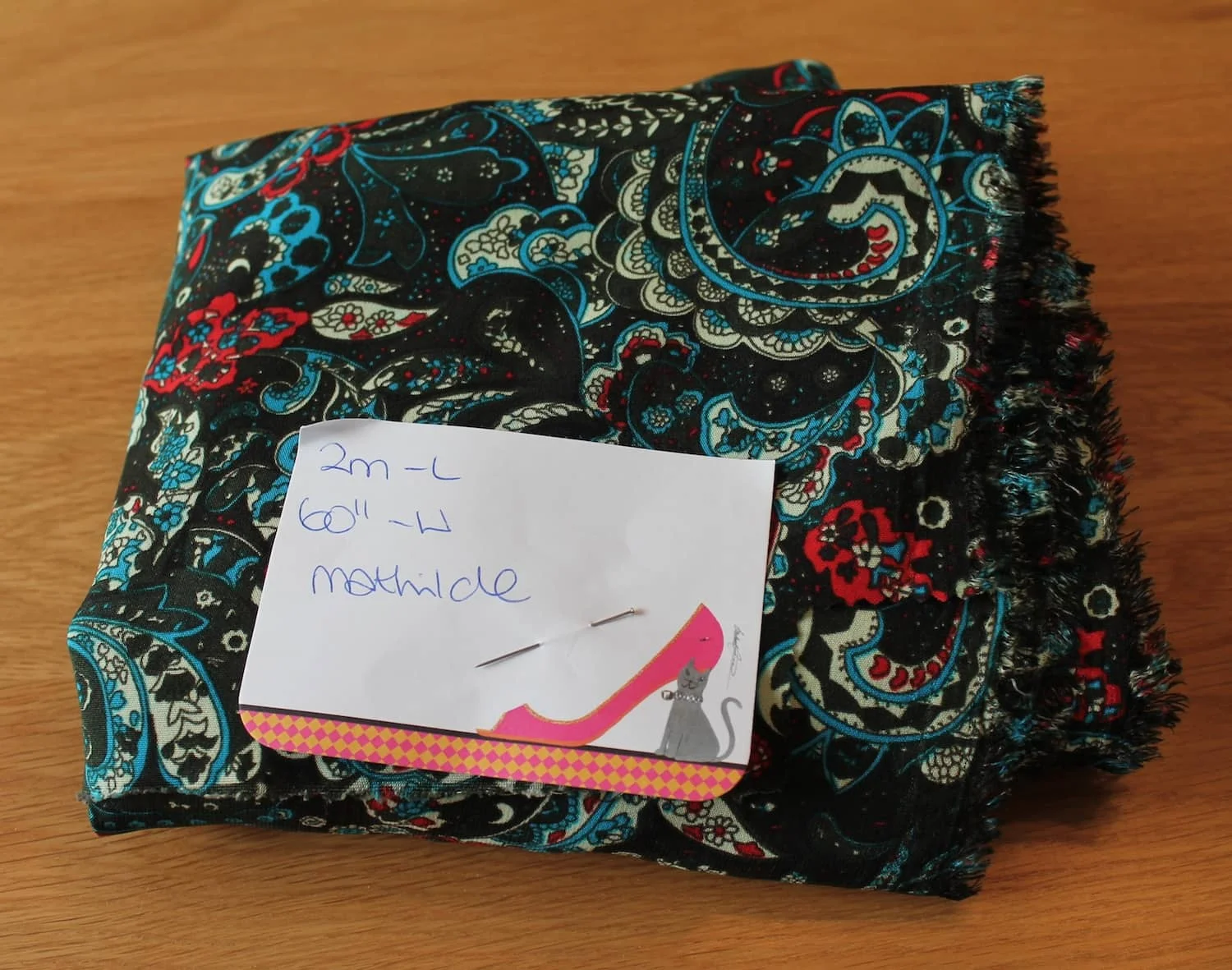 Here’s how I do it. As soon as a piece of fabric comes into my house, it gets washed, and then put in the fabric bag. By that time I will probably have an idea of what I want to make with it (if I haven’t bought it for a specific pattern), so I pin a piece of paper to it with the fabric length and width and what I want to make.