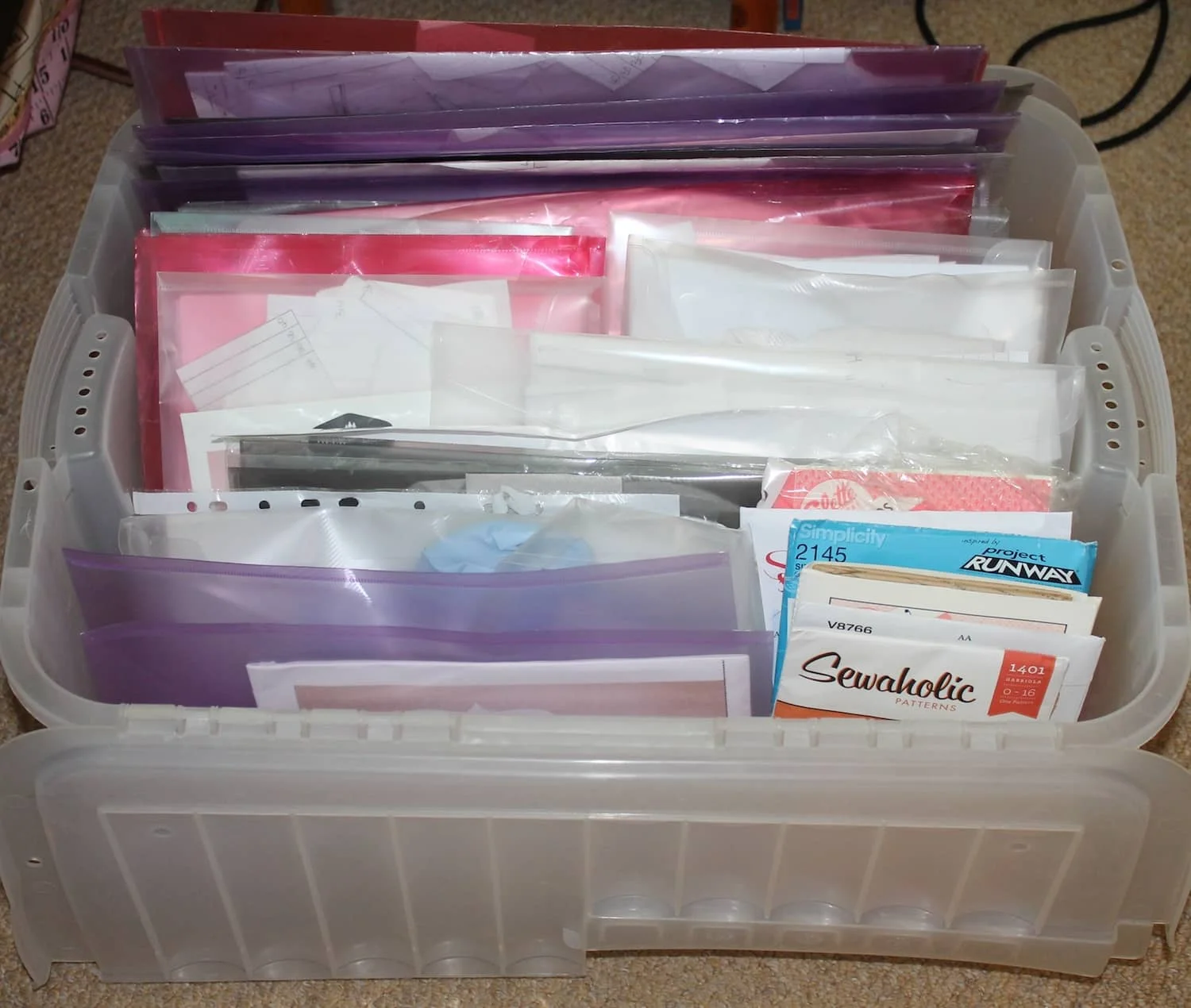 All my patterns are stored in a big box under a bed. The coloured plastic folders came from the pound shop. Unfortunately I haven't been able to get any of the A3 size for a while.