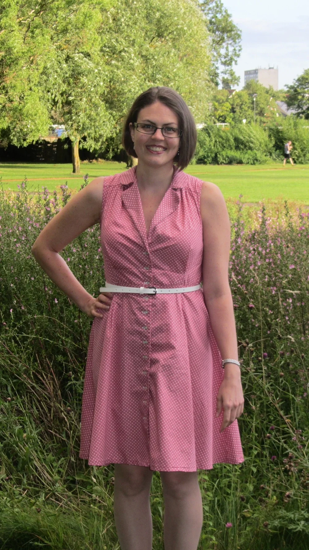 Due to the easy nature of cotton, this dress took no time to complete. The most time consuming part were the buttonholes. When buying the fabric, I decided to get the buttons too. I chose small white ones and knew that I would need more than the eight suggested by the pattern. I settled on twelve. Making the button holes reminded me of a lesson I knew but had forgotten. Sewing machines are, rightly, fussy eaters. I had the prefect matching pink thread that made the white buttons stand out from the fabric. Sadly I couldn't complete my plan as the thread is of poor quality and my machine just churned it up or snapped it with amazing ease. After the second failed attempt I switched to white thread. Lesson firmly re-learnt!